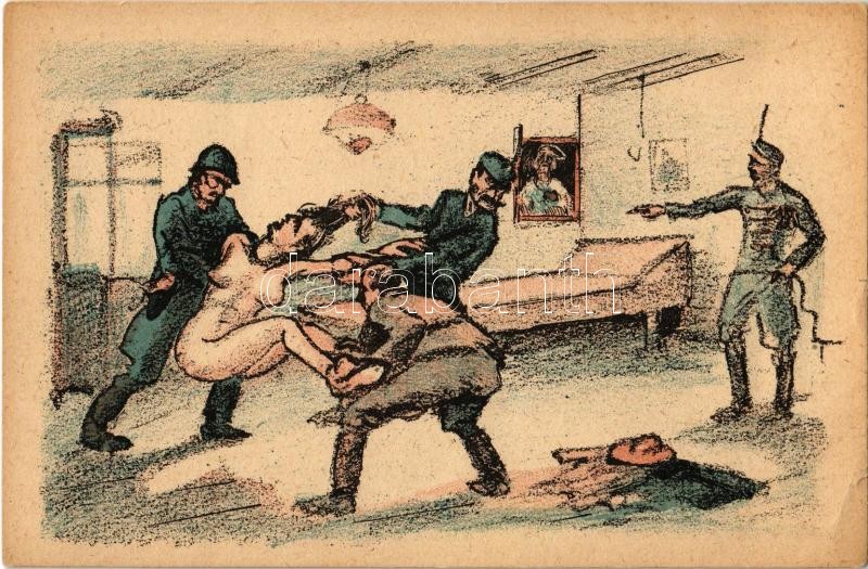 Megbecstelenítés. Fehérterror Magyarországon. Verlag der Arbeiter-Buchhandlung / White Terror in Hungary, left-wing propaganda card s: Bíró (EK)