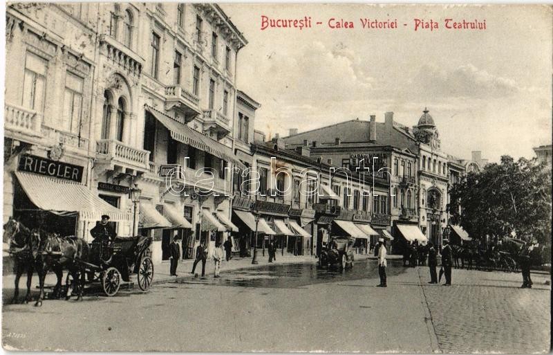 Description: 1914 Bucharest, Bucuresti; Calea Victorei, Piata Teatrului, Marele Hotel, Gaz Electricitale / street and square, automobile, chariots, shops of George Riegler and J. Matejka