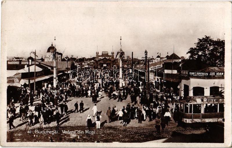 ~1930 Bucharest, Bucuresti; Vedere din Mosi / square, market, tram, Restaurant Unicum Berari, shop of Ioan S. Dumitrescu