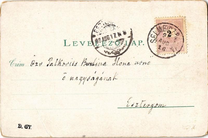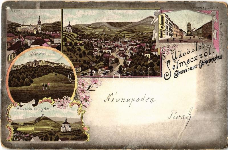 1898 (Vorläufer!) Selmecbánya, Schemnitz, Banská Stiavnica; Szentháromság szobor, Óvár, Szitnya, Kálvária és Új vár / Trinity statue, castles, Sitno, calvary. Joerges Art Nouveau, floral, litho (fa)
