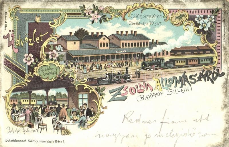 1898 Zsolna, Sillein, Zilina; Cs. kir. Szab. Kassa-Oderbergi vasút, vasútállomás gőzmozdonnyal, Pályaudvari vendéglő belső. Schwidernoch Károly / Kosice-Bohumín railway station with locomotive, railway restaurant interior. Art Nouveau, floral, litho (EK)