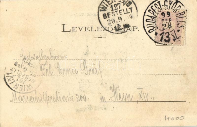 1899 Komárom, Komárnó; Fő tér, Nádor utca, Mészáros András üzlete. Czike D. kiadása / main square, street, shops + "BUDAPEST-GYŐR-BÉCS 13. sz." mozgóposta
