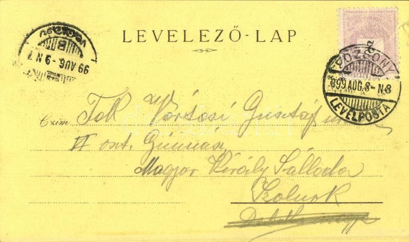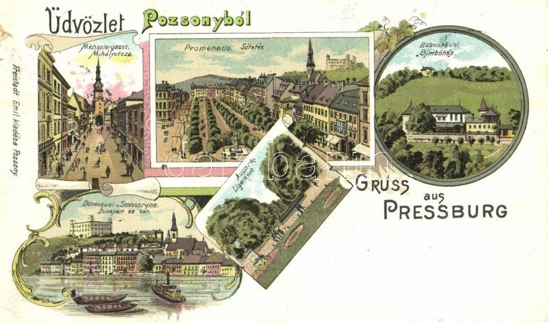 1899 (Vorläufer!) Pozsony, Pressburg, Bratislava; Mihály utca, Ligetkert, Bimbóház, Sétatér, Dunapart, vár. Freistadt Emil kiadása / street, park, villa, promenade, river bank, castle. Floral, Art Nouveau, litho (kis szakadás / small tear)