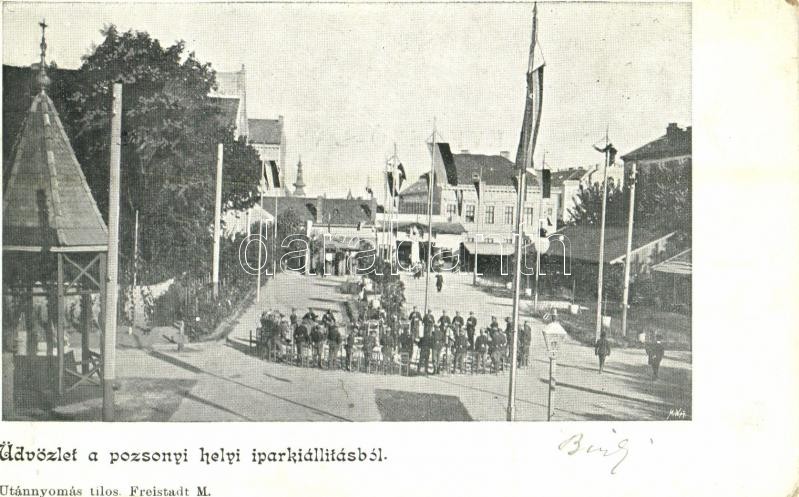 Description: 1899 (Vorläufer!) Pozsony, Pressburg, Bratislava; Pozsonyi Helyi Iparkiállítás, zászlók, zenekari próba a téren. Freistadt M. kiadása / Local Industry Exhibition, music band rehearsal