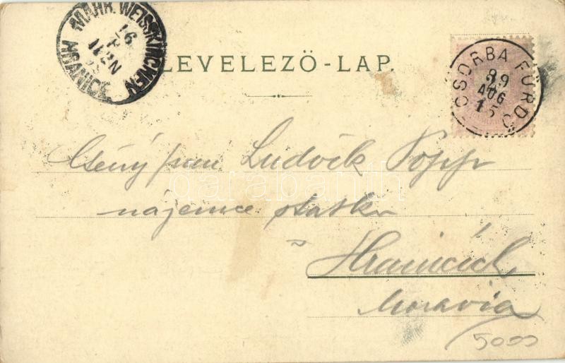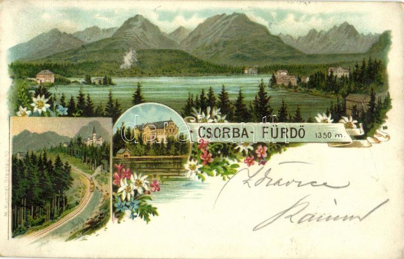 1899 (Vorläufer!) Tátra, Vysoké Tatry; Csorda-fürdő / Strbské pleso / lake, spa. M. Kuschel Art Nouveau, floral, litho (kopott sarkak / worn corners)