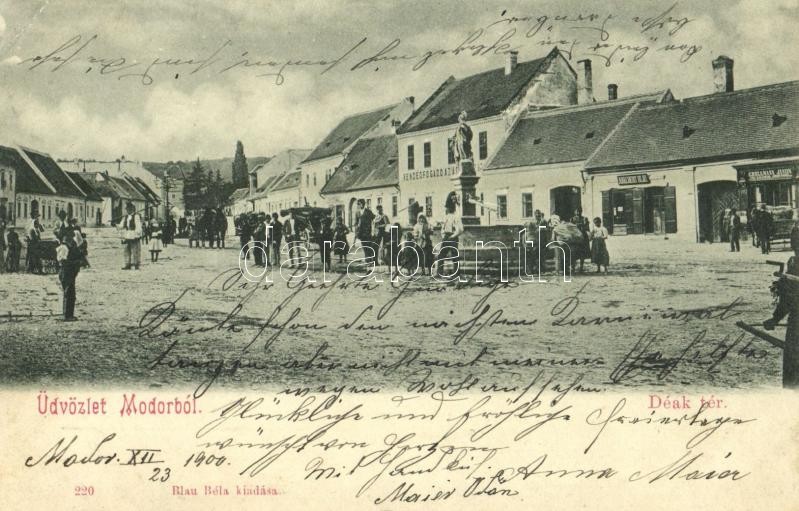 1900 Modor, Modra; Deák tér, Vendégfogadó, szobor, Adalbert Blau, Gsellmann János üzlete, étterem, piaci árusok. Kiadja Blau Béla / square, shops, restaurant, market vendors (EK)