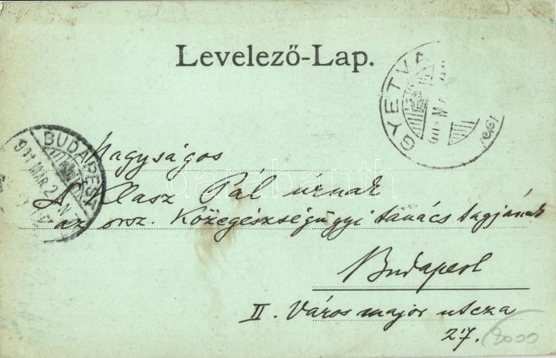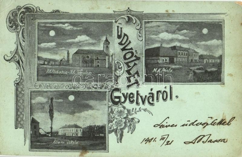 Description: 1901 Gyetva, Detva; Római katolikus templom és plébánia, M. kir. posta, állami iskola, este / church and parish, post office, school, night. Art Nouveau, floral (EK)