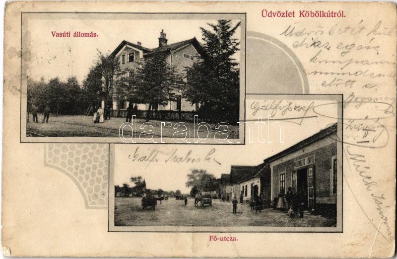 1906 Köbölkút, Gbelce; vasútállomás, Fő utca, Wiesenberg Dávid üzlete és kiadása / railway station, main street, shop (EK)