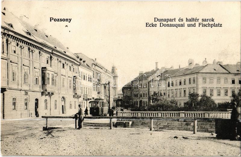 1907 Pozsony, Pressburg, Bratislava; Duna part és Hal tér sarok, villamos. Gelber kiadása / Ecke Donauquai und Fischplatz / square corner with tram