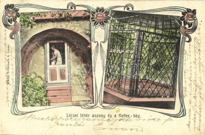 1908 Lőcse, Levoca; Lőcsei fehér asszony és a Ketter ház (szégyenketrec). Rosenbach S. kiadása / Julianna Géczy and the cage of shame. Art Nouveau