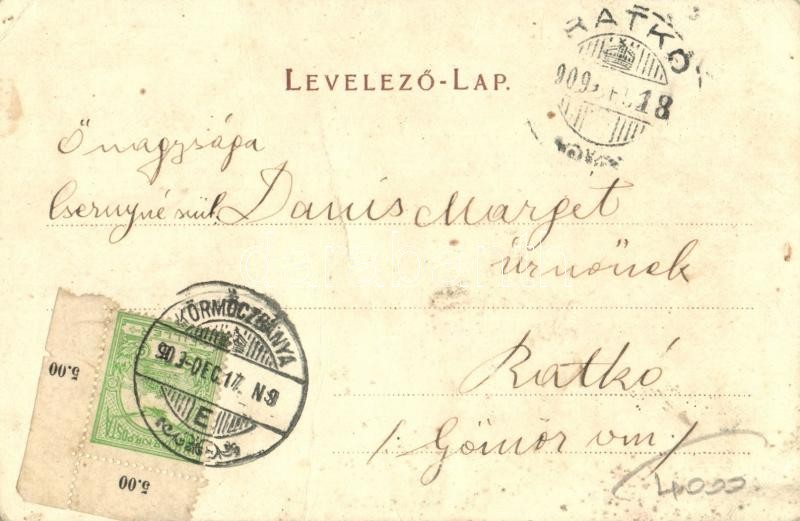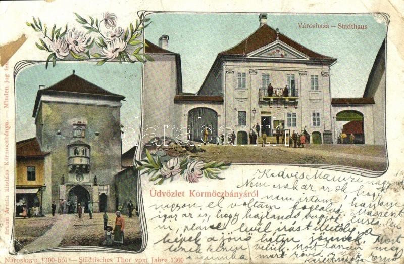 1909 Körmöcbánya, Kremnitz, Kremnica; Városháza, Városkapu 1300-ból. Braun Ármin kiadása / town hall, city wall from 1300. floral (fa)