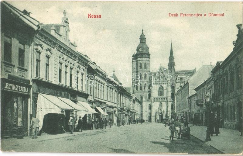 1910 Kassa, Kosice; Deák Ferenc utca, dóm, Liszt nagyraktár, üzletek /...