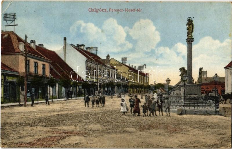1915 Galgóc, Hlohovec; Ferenc József tér, Szentháromság szobor, borbély, gyógyszertár, üzletek. Bródy Simon kiadása / square, Trinity statue, shops, pharmacy, barber (EK)