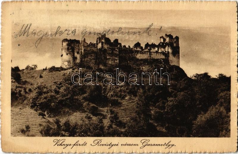 Description: 1918 Revistyeváralja, Revistye (Ricse, Újbánya), Revista, Revistské Podzámcie (Vihnyefürdő, Kúpele Vyhnye); várrom a Garamvölgyben. Herzog M. kiadása / castle ruins in the Hron valley (EK)