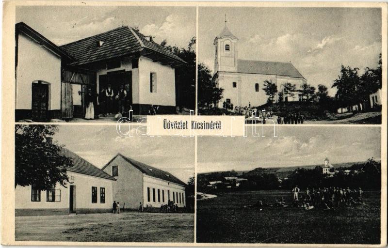 1941 Kicsind, Malá nad Hronom, Kicind; utcakép, üzlet, Római katolikus templom, Iskola, Garam parti részlet. Kiadja Jónás Goldstein / street view, shops, Catholic church, school, Hron riverside