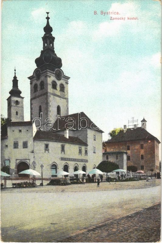 Besztercebánya, Banská Bystrica; Vártemplom, piac. P. Sochán kiadása / Zámocky kostol / castle church and market