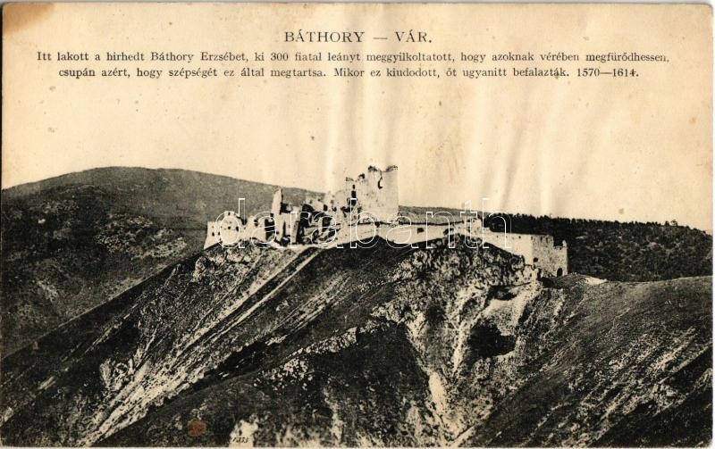 Csejte, Csejthe, Cachtice; Báthory vár, "Itt lakott a hírhedt Báthory Erzsébet, ki 300 fiatal leányt meggyilkoltatott, hogy azoknak vérében megfürödhessen, csupán azért, hogy szépségét el által megtartsa. Mikor ez kitudódott, őt ugyanitt befalazták." 1570-1614 / Hrad Báthorovcov / castle