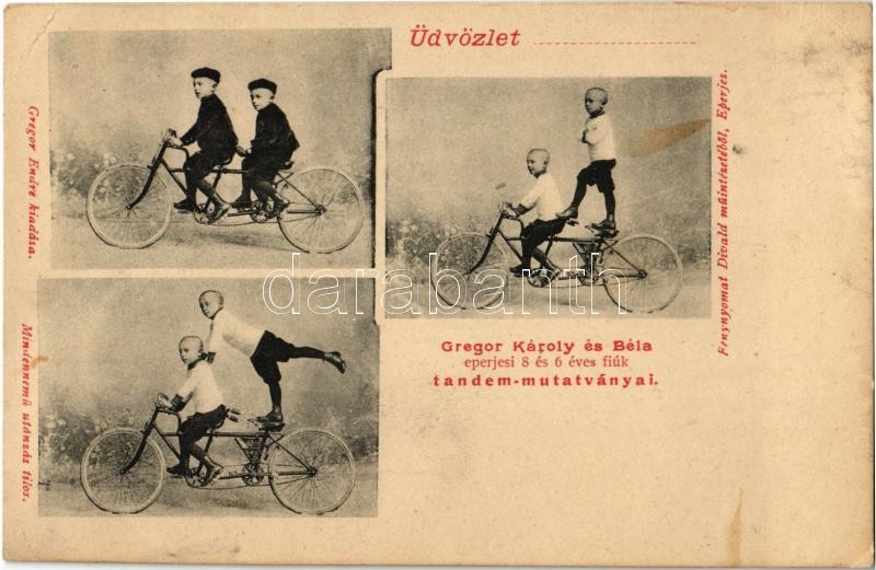 Eperjes, Presov; Gregor Károly és Béla 8 a 6 éves fiúk tandem mutatván... https://www.darabanth.com/en/32-Major-auction/32.1/Postcards/Slovakia~13727/Eperjes-Presov-Gregor-Karoly-es-Bela-8-a-6-eves-fiuk-tandem-mutatvanya-Gregor-Endre-kiadas~II2035174