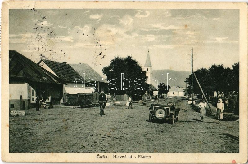 Hernádcsány, Csany, Cana; Fő utca, autó, kerékpáros, templom. Adolf Gü...