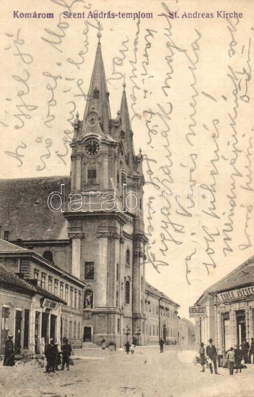 Komárom, Komárnó; Szent András templom, utca, Korén József és Leisz Nándor üzlete / street view with church and shops (EK)