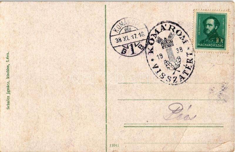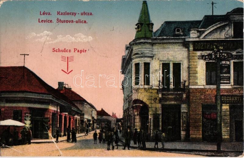 Description: Léva, Levice; Kazinczy utca, Osztrák-magyar bank, Fonciere pesti biztosító, Borcsányi üzlete, Schulz Ignác papírüzlete és saját kiadása / Sturova ulica / street view with Austro-Hungarian bank, insurance company and shops "1938 Komárom visszatért" So. Stpl (fa)