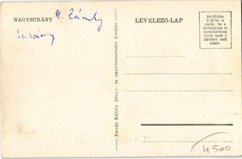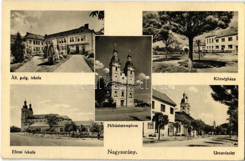 Nagysurány, Surany; Állami polgári és elemi iskola, plébániatemplom, községháza, utca, Városi szálloda. Peczár Károly kiadása / schools, church, town hall, street, hotel