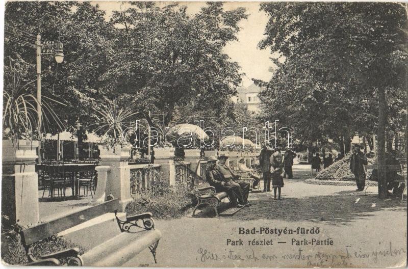 Pöstyén-fürdő, Kúpele Piestany; park, étterem terasza, padok. Párisi V...