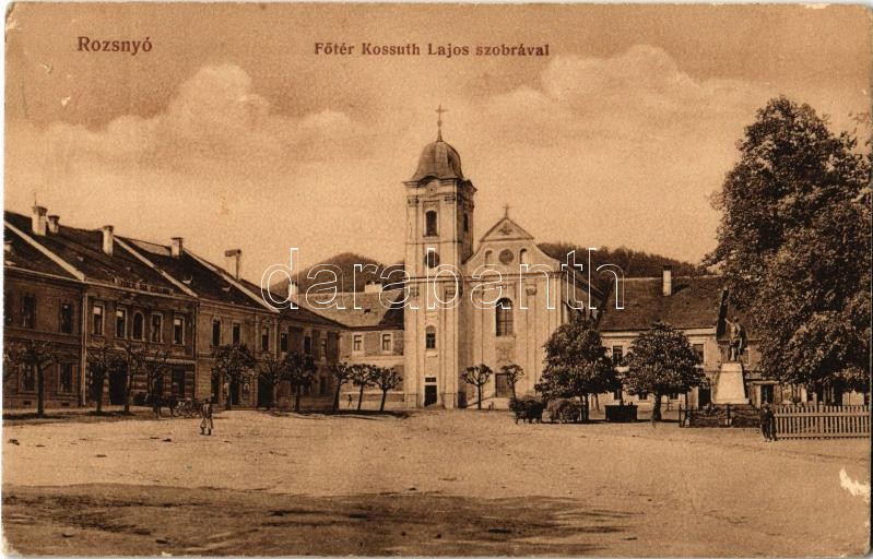 Rozsnyó, Roznava; Fő tér, Kossuth Lajos szobor, templom, Fekete Sas sz...