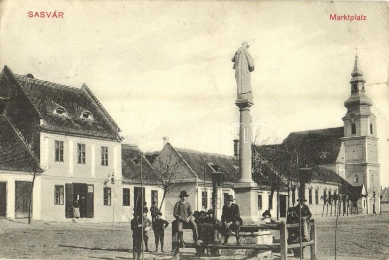 Sasvár, Sastín, Mária Sasvár, Maria-Schlossberg; Piac tér, templom, üzlet, szobor / Marktplatz / market square, church, shop, statue (szakadások / tears)