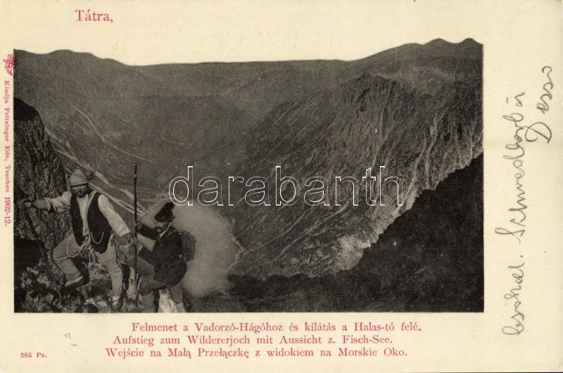 Description: Tátra, Vysoké Tatry; Felmenet a Vadorzó-Hágóhoz és kilátás a Halas-tó felé / Aufstieg zum Wildererjoch mit Aussicht z. Fisch-See / Wejscie na Mala Przelaczke z widokiem na Morskie Oko. Feitzinger Ede 1902-12. 285 Ps.