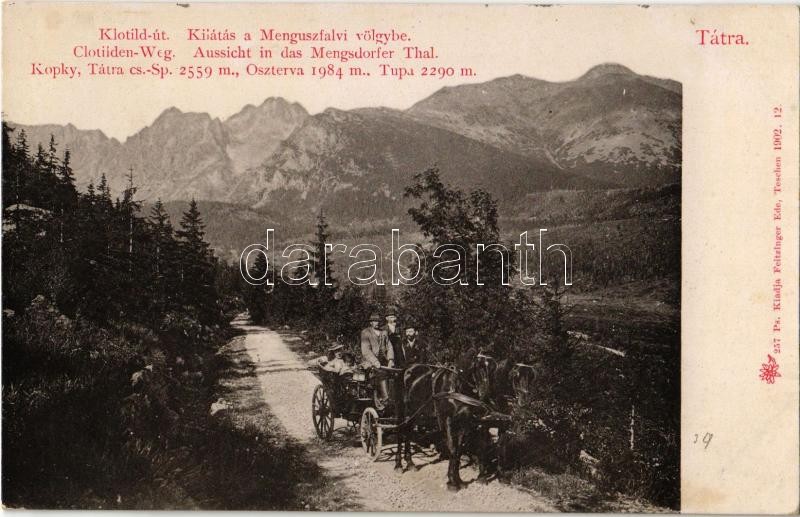 Tátra, Vysoké Tatry; Klotild út, kilátás a Menguszfalvi völgybe, lovas hintó. Feitzinger Ede 1902-12. 257 Ps. / Mengusovská dolina, road, horse chariot