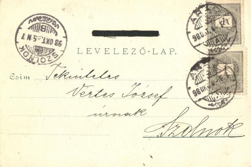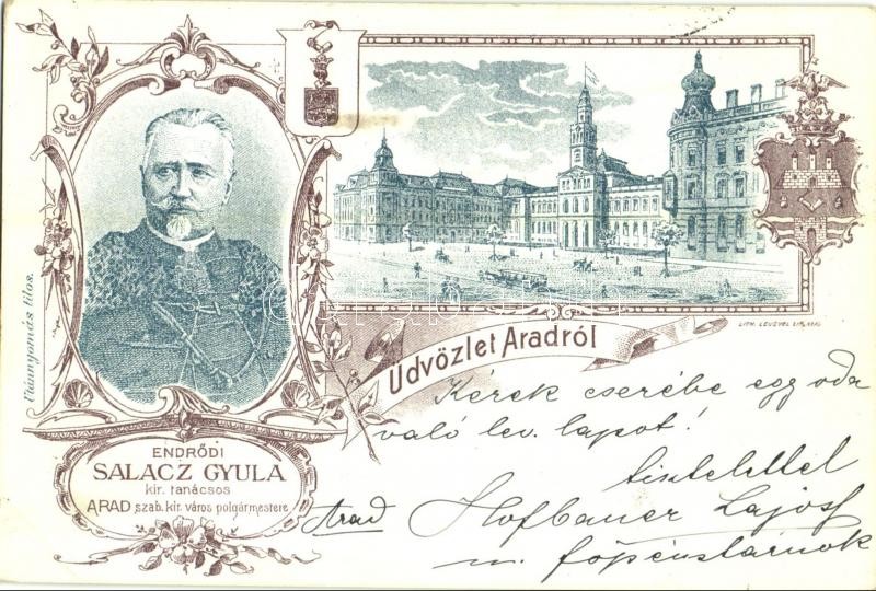 Description: 1898 (Vorläufer!) Arad, Városház tér, Endrődi Salacz Gyula királyi tanácsos és Arad szab. kir. város polgármestere. Lengyel Lipót kiadása / town hall square, mayor, coat of arms. Art Nouveau, floral (EK)
