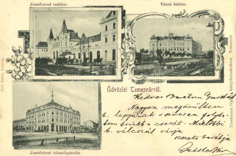 1898 (Vorläufer!) Temesvár, Timisoara; Józsefvárosi indóház és takarékpénztár, vasútállomás, Városi bérház, vasúti sín. Trautmann György kiadása / Iosefin, railway station, savings bank, tenement house, railway tracks. Art Nouveau, floral (EK)