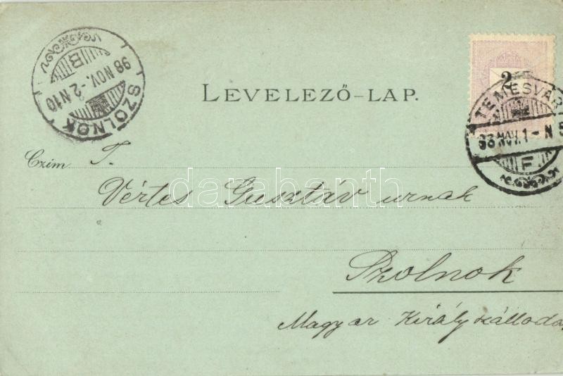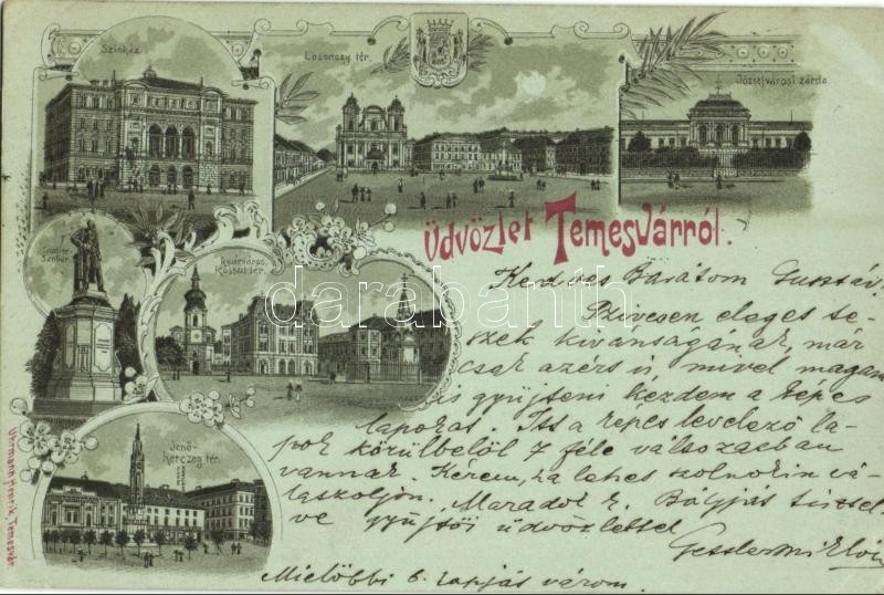 1898 (Vorläufer!) Temesvár, Timisoara; színház, Józsefvárosi zárda, Gyárváros, Kossuth, Jenő herceg és Losonczy tér, Scudier szobor, Heinrich Uhrmann kiadása / Fabrica, theatre, squares, nunnery, monument. Art Nouveau, floral, litho