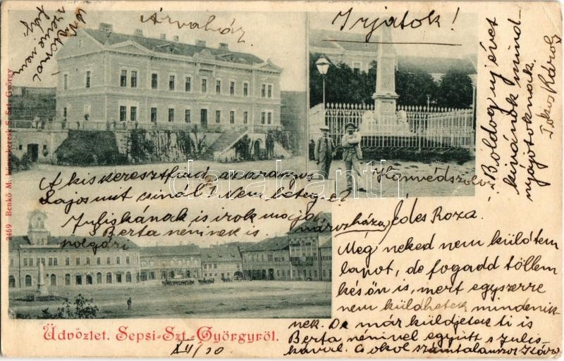 1901 Sepsiszentgyörgy, Sfantu Gheorghe; Árvaház, Honvéd szobor, Fő tér. Benkő M. kiadása / orphanage, main square, military monument (Rb)