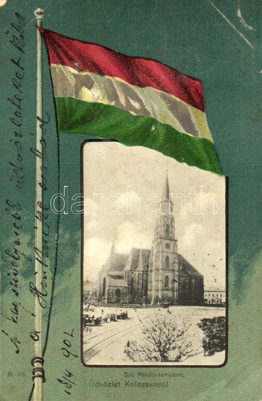 1902 Kolozsvár, Cluj; Szent Mihály templom, piac. magyar zászlós litho...
