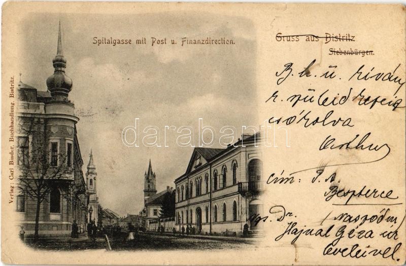 Description: 1903 Beszterce, Bistritz, Bistrita; Kórház utca, Posta és Pénzügyigazgatóság / Spitalgasse, Post und Finanzdirection / street view, post office and fincancial directorate (EK)