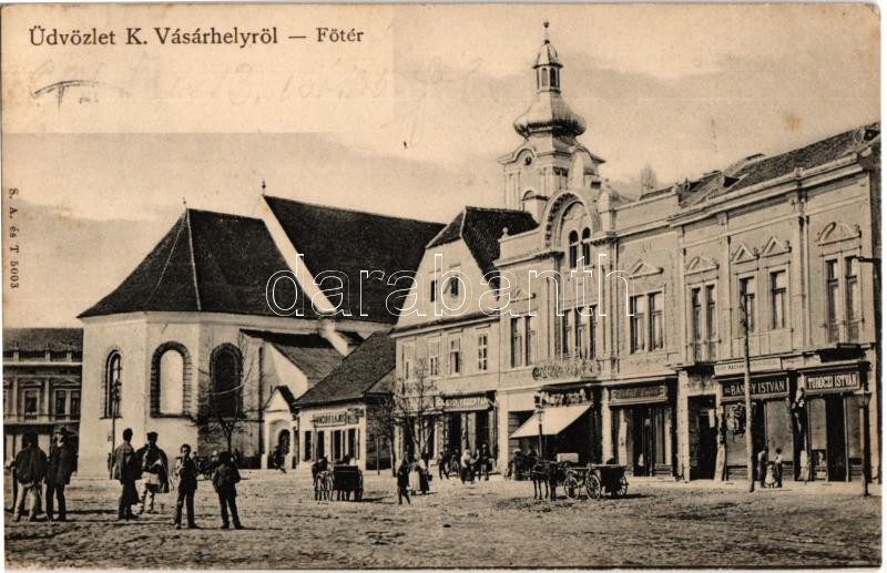 Description: 1904 Kézdivásárhely, Targu Secuiesc; Fő tér, templom, Jancsó F. Lajos, Turóczi István, Ifj. Bándy István üzlete, gyógyszertár / main square with shops, church and pharmacy
