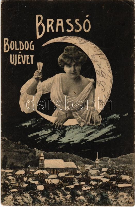 Description: 1905 Brassó, Kronstadt, Brasov; téli látkép. Boldog Újévet montázs pezsgős hölggyel a holdban / winter. New Year greeting montage with lady and champagne in the moon (EK)