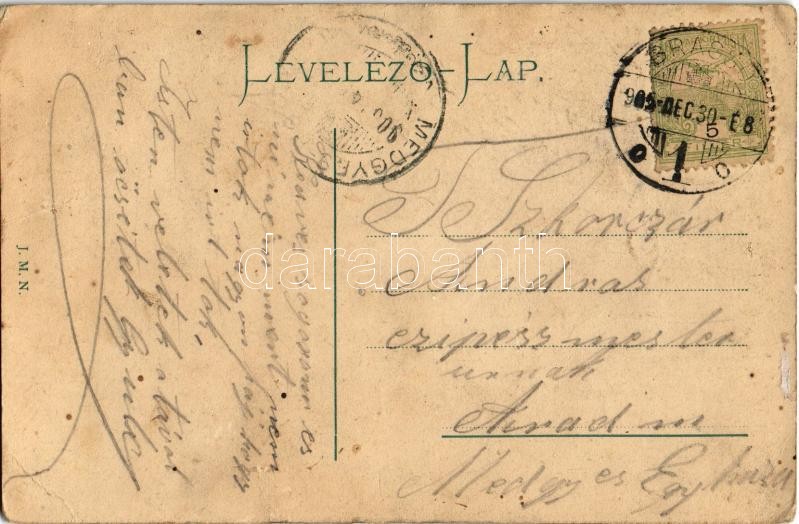 1905 Brassó, Kronstadt, Brasov; téli látkép. Boldog Újévet montázs pez... https://www.darabanth.com/en/32-Major-auction/32.1/Postcards/Transylvania~13726/1905-Brasso-Kronstadt-Brasov-teli-latkep-Boldog-Ujevet-montazs-pezsgos-holggyel-a-holdb~II1939150