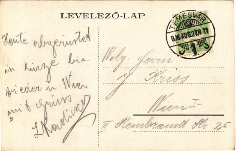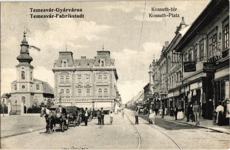 1906 Temesvár, Timisoara; Gyárváros, Kossuth tér, templom, Adler Ignác, Csendes és Fischer, Szana Lajos, Deutsch R. Rezső és Klug János üzlete, takarékpénztár, lovashintók / Fabrica, street view with church, shops, savings bank, horse chariots
