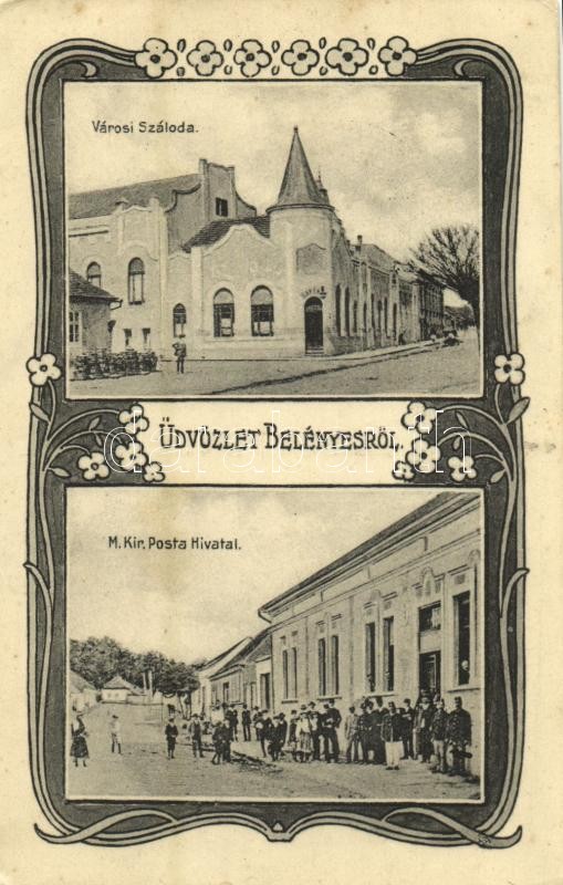 1916 Belényes, Beius; Városi szálloda, M. kir. postahivatal. Süssmann Lázár kiadása / hotel, post office. Art Nouveau, floral (EK)