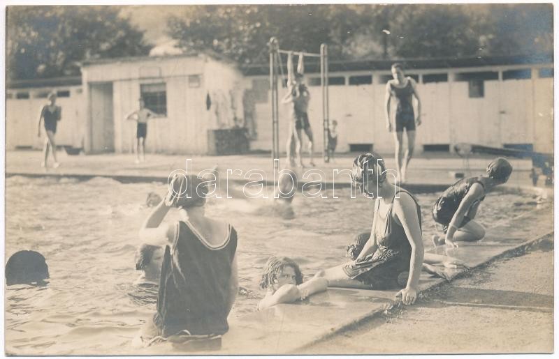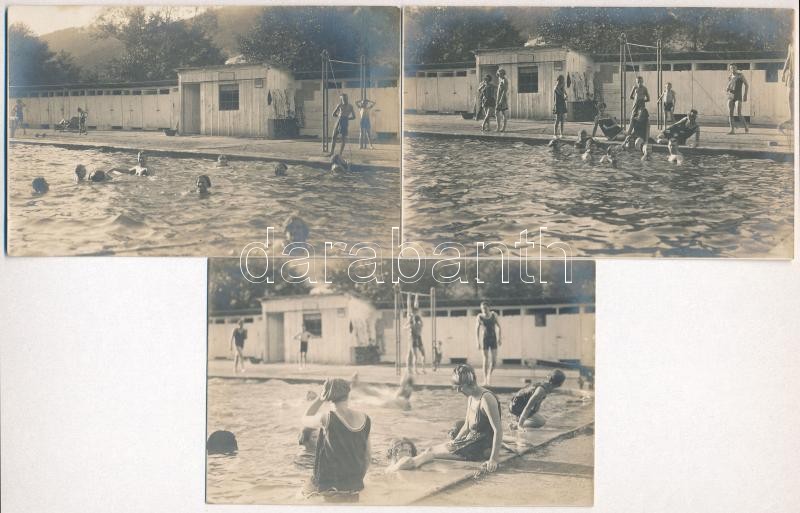 Description: 1925 Resica, Resita; strand, fürdőzők a medencében / spa, bathing people in the swimming pool - 3 db eredeti fotó képeslap / 3 original photo postcards