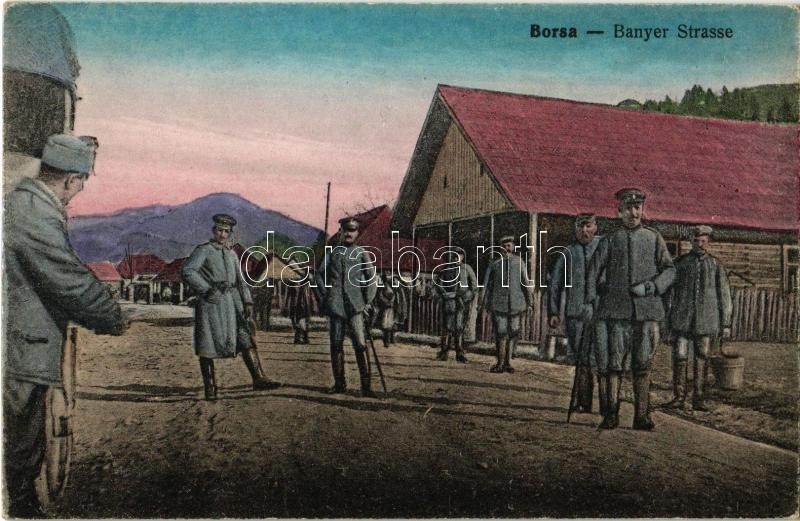 Borsa, Borscha; utca katonákkal / Banyer Strasse / street view with soldiers