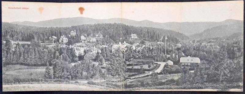 Borszék-fürdő, Baile Borsec; 4-lapos kinyitható képeslap a nyaralókkal. Divald Károly 1947-1908. / 4-tiled folding card with villas (EK)