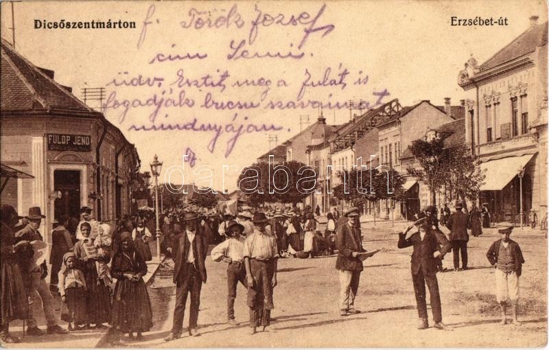 Dicsőszentmárton, Tarnaveni, Diciosanmartin; Erzsébet út, piac árusokk... https://www.darabanth.com/en/32-Major-auction/32.1/Postcards/Transylvania~13726/Dicsoszentmarton-Tarnaveni-Diciosanmartin-Erzsebet-ut-piac-arusokkal-Fulop-Jeno-uzlete~II1943572