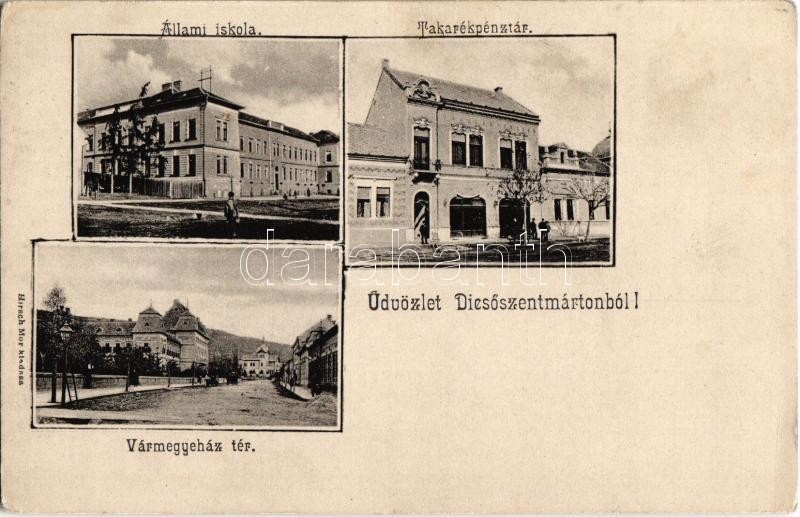 Description: Dicsőszentmárton, Tarnaveni, Diciosanmartin; állami elemi iskola, takarékpénztár, Vármegyeház tér. Hirsch Mór kiadása / school, savings bank, county hall's square