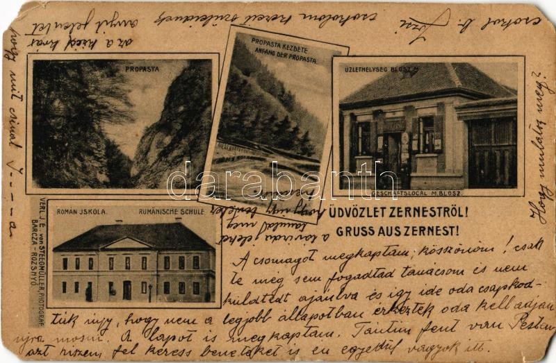 Zernest, Zernyest, Zarnesti; Propasta kezdete, Román iskola, Blosz M. üzlete / Prapastiile Zarnestilor / Anfang der Propasta, Geschäftslocal M. Blosz, Rumänische Schule. Verlag v. J. E. Steegmüller Photograf / gorge, shop front, Romanian school (EM)
