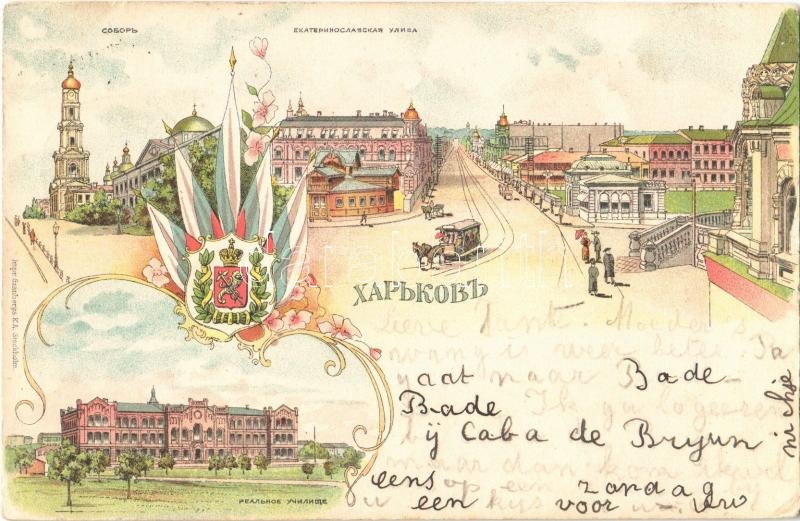 1904 Kharkiv, Kharkov, Harkov, Chárkiv, Charkow; cathedral, Yekaterinoslav street, real school, horse-drawn tram, coat of arms. Art Nouveau, floral, litho (EK)