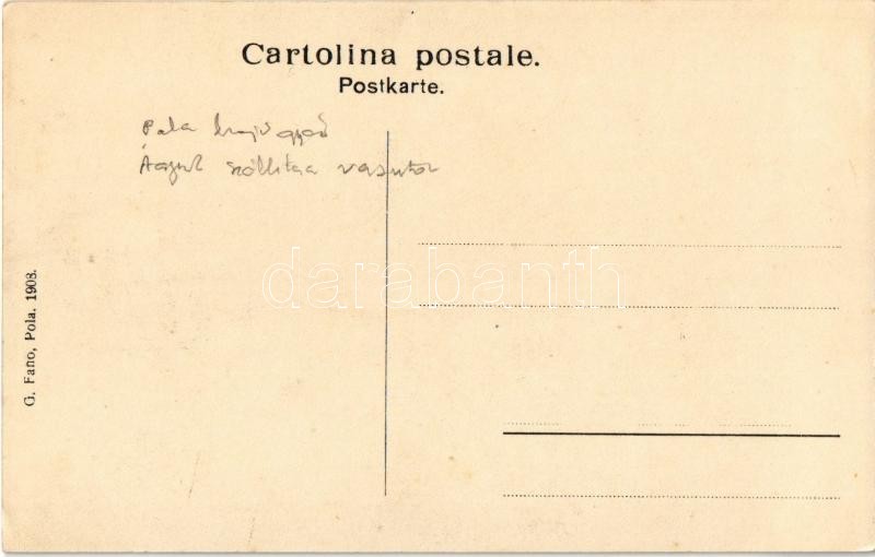 Description: 28 cm Geschütze. Transport und Depot. K.u.K. Kriegsmarine / Trasporto e deposito dei cannoni da 28 cm / 28 cm-es hajóágyúk szállítása vasúton Polában a hajógyárban / Austro-Hungarian Navy shipyard in Pola, battleship cannons transportation via railway tracks. G. Fano, 1908.